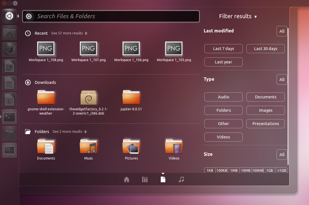 Also, Dash has its own window buttons which can be used to maximize or close it [2]. Further more, all Unity elements become semi-transparent when clicking Dash (and Dash inherits the wallpaper color):